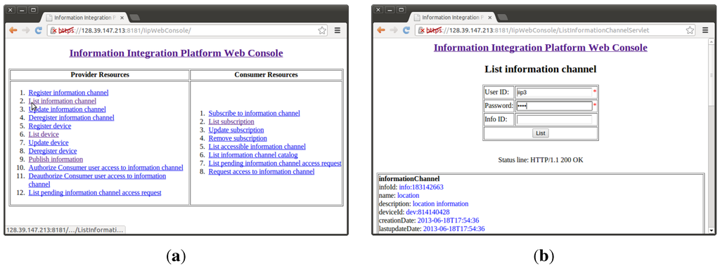 The IIP’s functionalities are exposed as RESTful web services. While this can be seen as a positive way to enable brokered machine-to-machine (M2M) communications, human intervention is rather difficult to accommodate. Although communications between devices, the IIP and services should ideally be automated, human involvement is sometimes needed, especially during the development process of new services. A web console for the IIP has been implemented to ease the management of resources in the IIP (e.g., information channels, devices, subscriptions, access control) for both information providers and consumers with simple HTML pages. This web application utilizes the same REST interfaces that information providers and consumers use. Figure 14a shows the main page of the web console, which contains functionalities for both information providers and consumers. Figure 14b shows a web page for information providers to list their information channels. Each resource requires the user to enter HTTP basic authentication credentials like normal applications do.