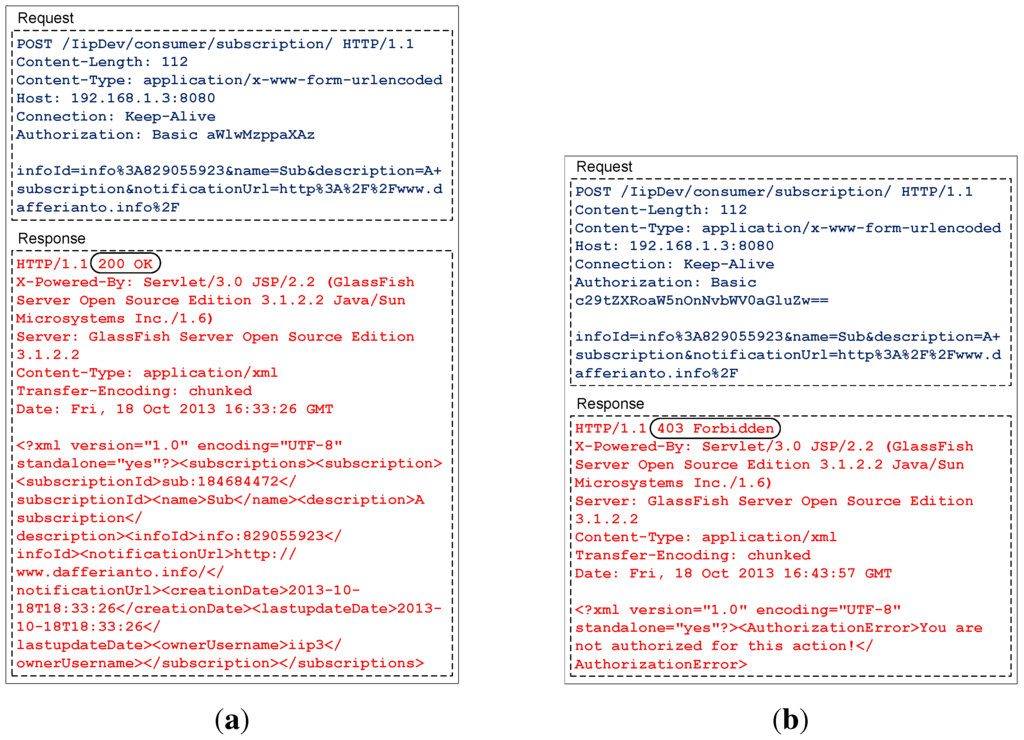 As described in the previous section, HTTPS is used for securing message exchanges between information providers, consumers and the IIP, by means of encryption. This will minimize the success rate of man-in-the-middle attacks. To maintain information privacy between applications, HTTP basic authentication credentials are directly used in IIP for authorizing applications to access different information channels. Information consumers that are not listed in an information channel’s allowed user list will not be able to access or subscribe to that particular channel. Figure 15a shows a test case where an HTTP POST request is sent from a test client application, acting as an information consumer, to the IIP for subscribing to an information channel with infoId info:829055923. The username, which is used by the information consumer, is listed in the information channel’s allowed user list, and thus, a 200 OK response is returned by the IIP, containing a representation of the subscription in XML format in its body. Figure 15b shows another test case where similar HTTP POST request for subscription to the same information channel is sent from an information consumer. This time, however, the username used by the information consumer is not listed in the information channel’s allowed user list, and therefore, the IIP returns a 403 Forbidden response with an XML-formatted message in its body, informing that the username is unauthorized to subscribe to the targeted information channel. All messages in both tests (Figure 15a,b) are captured using Wireshark, and HTTPS is not used (otherwise all packets are encrypted and cannot be interpreted). It can be concluded from the conducted tests that the implemented information channel access management scheme by directly utilizing HTTP basic credentials works as intended.