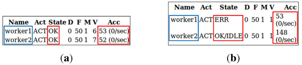 Seven hosts (machines) are used for deploying the clustered prototype of the IIP, where one is utilized as a proxy server for load balancing requests from both information providers and consumers, two are used for deploying the main applications that handle requests forwarded (load balanced) by the proxy/load balancer host, another two are employed for data and SQL nodes of the MySQL Cluster that act as the main storage for the IIP and the last two are utilized for management nodes of the MySQL Cluster. This set-up conforms with Figure 9 and can be considered as the minimum requirement for IIP’s high availability, where all nodes have exactly one redundant backup (except the load balancer). New nodes can be added when deemed needed. A test was conducted to review the general functionality of the load balancing between the redundant nodes being deployed. A test client application was developed, playing the role of information provider that keeps sending one publication message per second to one of its information channels through the load balancer host. Initially, both application servers’ hosts are up and running, and the load balancer host distributes the requests evenly to both application servers. As can be seen in Figure 16a, the load balancer host (acting as a proxy) successfully forwards all requests evenly to both application servers’ hosts (i.e., 53 and 52 requests for worker1and worker2, respectively). One of the two application servers’ hosts was then turned off during the test, leaving only one application server available for handling all requests. From Figure 16b it can be seen that the load balancer host forwards all requests to the available application server’s host (worker2), and worker1’s state was changed to error. From this test, it can be concluded that the redundancy of the application nodes works well for providing highly available service, while enabling new nodes to be added (horizontal scaling) and load balanced to serve incoming requests.