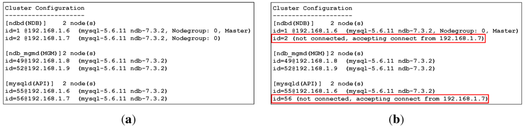 Snapshot of ndb_mgm client showing the most current MySQL Cluster configuration: (a) Both data and SQL node hosts are up and running; (b) One data and SQL node host (192.168.1.7) are down.