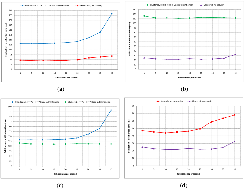 Four experiments were conducted in this category. All variables are fixed, except the publication rates of the information provider application, which were varied between one and 40 publications per second, and all publication and notification messages contain only one parameter. The first experiment applied the security measures (i.e., HTTPS and HTTP basic authentication) in a standalone IIP set-up, while the second experiment did not incorporate any security mechanism, also in a standalone set-up. The third and fourth experiments were conducted in a clustered IIP set-up, where security was applied in the third experiment and was ignored in the fourth experiment. Each measurement in all experiments lasted five minutes, generating 300 to 12,000 data messages (depending on the publication rate). Each measurement was performed three times to ensure data consistency, and the first 1% of the captured data is removed from every measurement to avoid the start-up effect of the application servers in serving incoming requests. All measurement data were averaged and plotted alongside confidence intervals at the 95% confidence level.