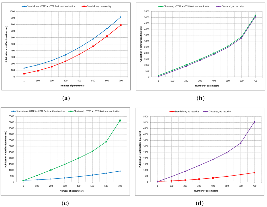 A comparison of total average publication and notification times between the secured and non-secured standalone IIP deployments is shown in Figure 19a. The time difference starts at about 85 ms when one parameter is used, and the gap increases almost linearly to around 125 ms when 700 parameters are used. This gap represents the implemented security mechanism’s overhead in the standalone IIP set-up.