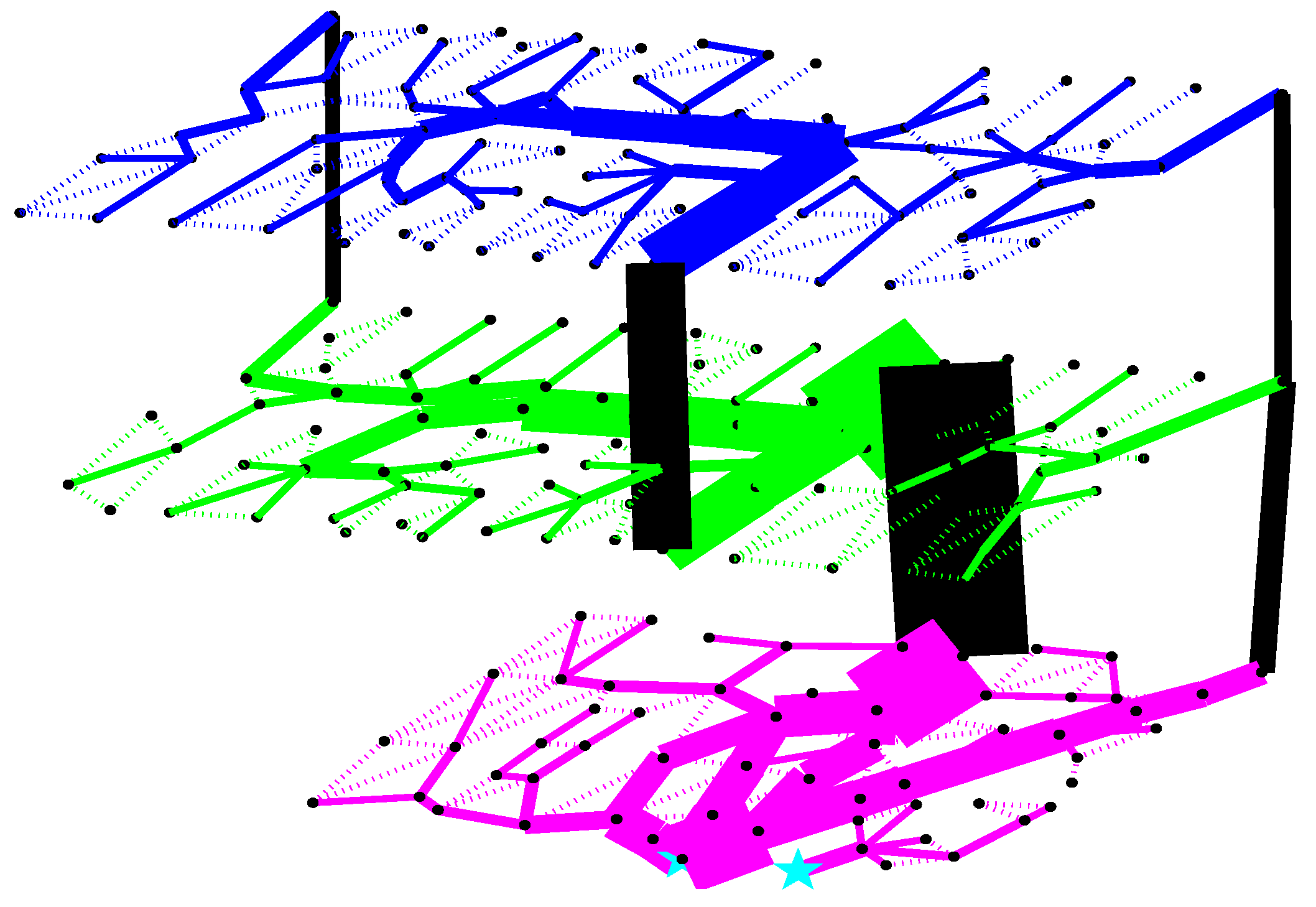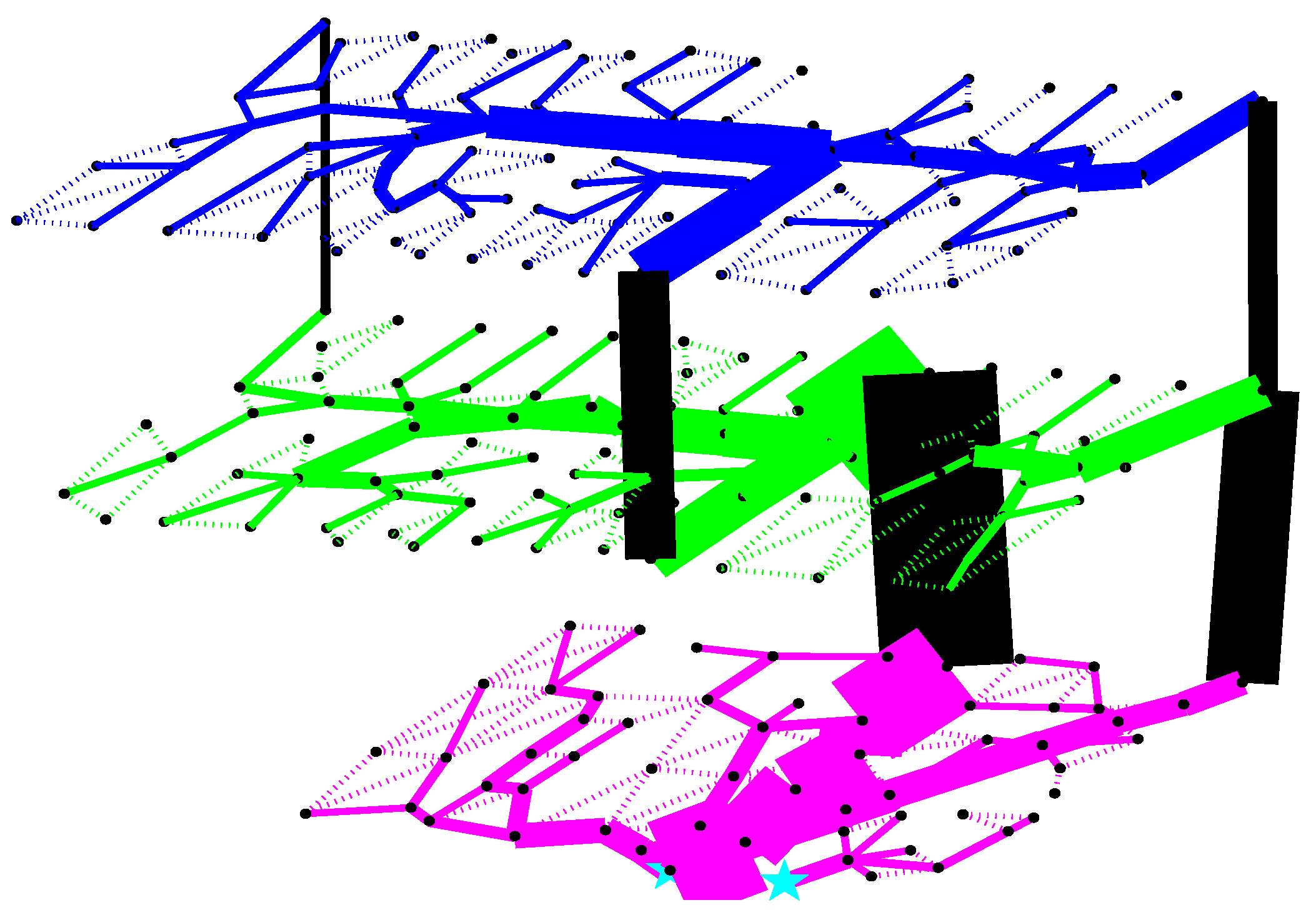 Figure 14 show the number of visits of each edge in a scenario with 120 homogeneous evacuees. The thickness of the solid line is proportional to the number of visits. The edges that have not been traversed are shown as dotted lines.