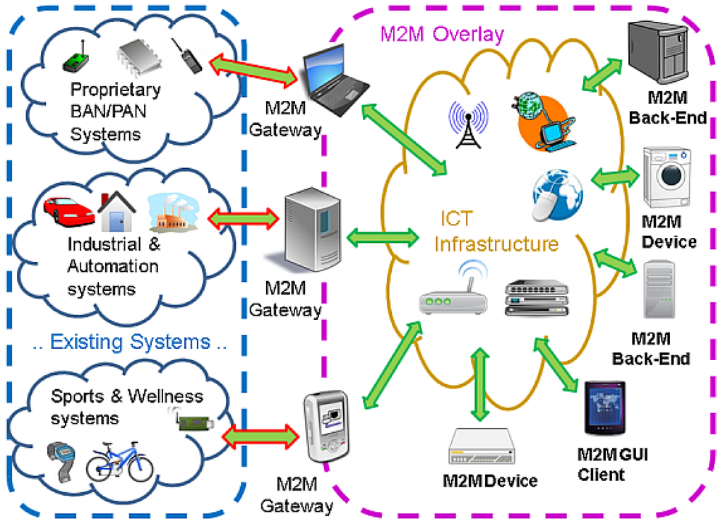 The role of the M2M gateway as the enabler of interoperation between different M2M systems such as body area network (BAN)/personal area network (PAN), Industrial and Automation and Sport and Wellness systems is visualized in Figure 2. These different M2M systems can establish their own small (local and/or wide area) M2M ecosystem, which can then be connected with the rest of the system via M2M gateways. The overlay communication between the different M2M gateways, M2M asset devices (those that are not behind the M2M gateways) and back-end servers enables establishment of bigger M2M ecosystem with interoperable messaging enabled by the communication overlay.