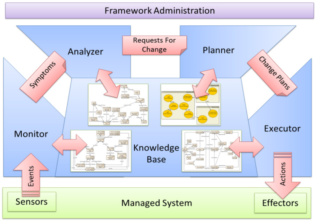 The control loop consists of modules for monitoring, analyzing, planning and executing, Figure 4. Monitoring module answers to the question “what is happening?” It collects events from sensors from managed resources, updates a model describing the sensors environment and topology located on the knowledge base with relevant information from events, and infers new knowledge about symptom occurrences, then extracts relevant information and sends them to the analyzer.