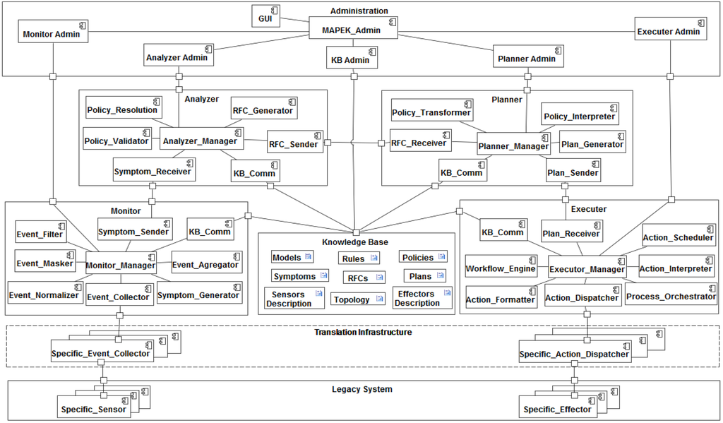 A translation infrastructure is provided to keep the autonomic manager generic and to facilitate the mapping between the autonomic manager and legacy M2M systems, Figure 4. The administration layer enables to supervise and configure each autonomic module subcomponents for best performance.