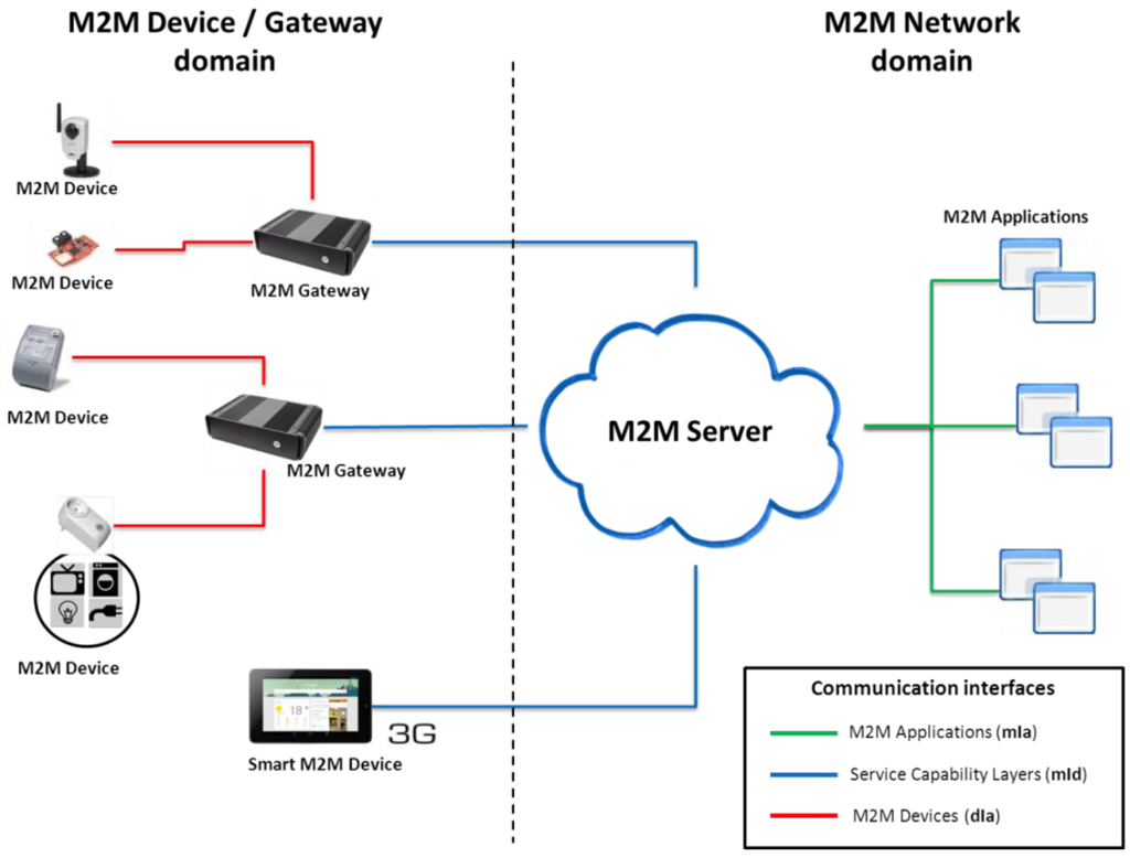 The ETSI M2M architecture is based on a set of horizontal service capability layers that can be applied to several vertical M2M application domains. These service capability layers are composed of a set of generic services and are deployed in M2M Servers, M2M gateways and smart M2M devices. The different service layers are distinguished by the role they provide in the architecture. Two domains are defined by the ETSI: a local domain with M2M device and gateways called Device and Gateway domain, and a WAN domain with M2M servers, core network access, M2M applications and management functions called Network domain, Figure 6. Data exchange between the different M2M entities in the different domains is done through 3 standardized communication interfaces: dIa, mId and mIa.