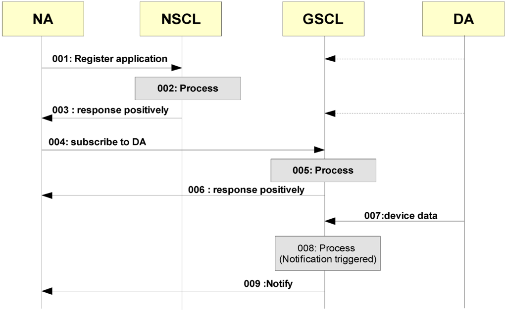 Non-ETSI compliant M2M entities (existing systems and devices) can be integrated to the architecture using the specified integration points (Interworking Proxy) on the Gateway and Network Service Capability Layers [5]. In the local domain the M2M Gateway acts as a proxy for M2M devices available in the same local area network. Once M2M devices applications are registered, they become available to other registered SCLs and M2M applications; according to the acquired access rights. For example, network applications can subscribe to information produced by a sensor (Device application) registered on a reachable GSCL, Figure 8. We presume that the GSCL is registered to the NSCL and that the Device Application is registered to the GSCL. First, the Network application registers to the NSCL (001). Then the Network Application Enablement capability checks if the issuer is authorized to be registered and treats the request (002). The registration information is then stored by the Network Reachability, Addressing and Repository Capability. The Network Application receives a positive answer (003). The Network Application subscribes to the data produced by the desired sensor (Device application) (004). This data can also follow a certain criteria specified by the issue. If the issuer is authorized to subscribe to the given Device Application, the Gateway Reachability, Addressing and Reachability capability treat the request (005). The Network application receives a positive response (006). Device application sends information to the Gateway (007). The Gateway Reachability, Addressing and Repository Capability identify an event that needs to be reported to a subscriber (008). Finally, the GRAR Capability notifies the subscribers (009).