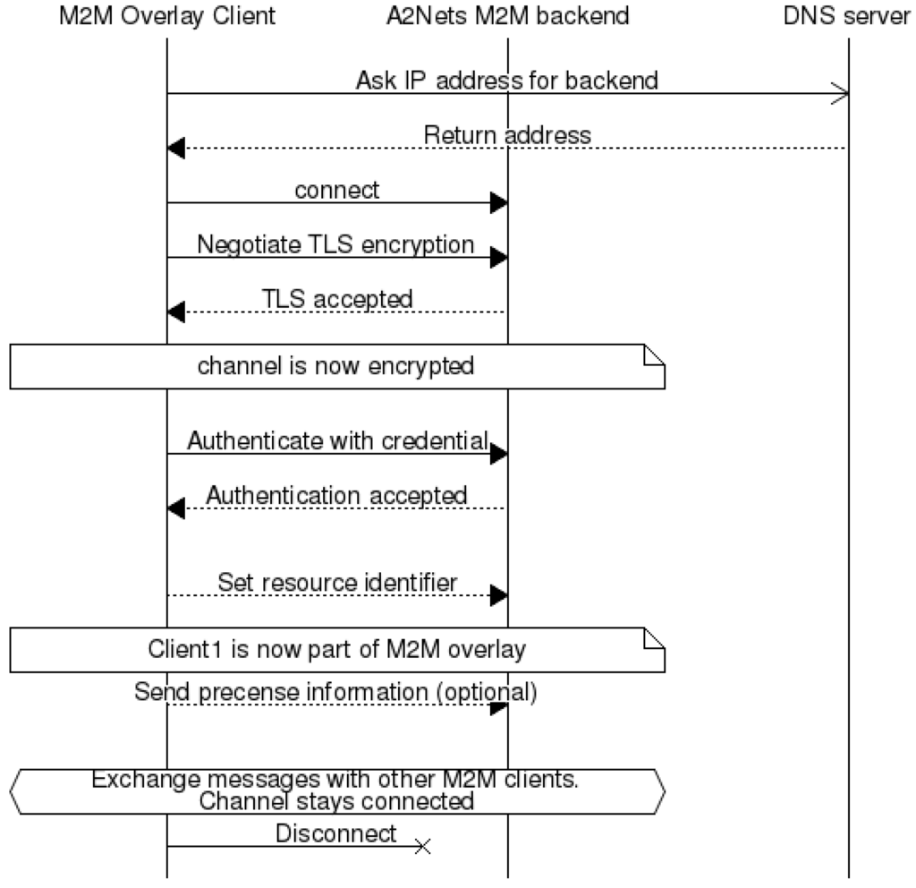 A client connects to the server to send and receive messages. The procedure for M2M client establishing connection with the XMPP server is shown in Figure 10. Discovery can be done directly using a domain part as a server address or discovering server address with SRV lookup from DNS. All clients connect to only their own server specified by JID. Connections are persistent XML streams over TCP and optionally encrypted by Transport Layer Security (TLS) layer. Encryption of TCP stream is strongly recommended, but not required. An administrator of a domain may specify that encryption is mandatory and it is up to administrator or designer to choose whether TLS certificates should be checked. Most client libraries accepts self-signed certificates, this should be taken into account when considering security aspects of client-to-server connections. The availability of each client can be detected with the aid of presence messages. Presence information is shared only with XMPP user’s that are in roster/address book of client sending the presence information.