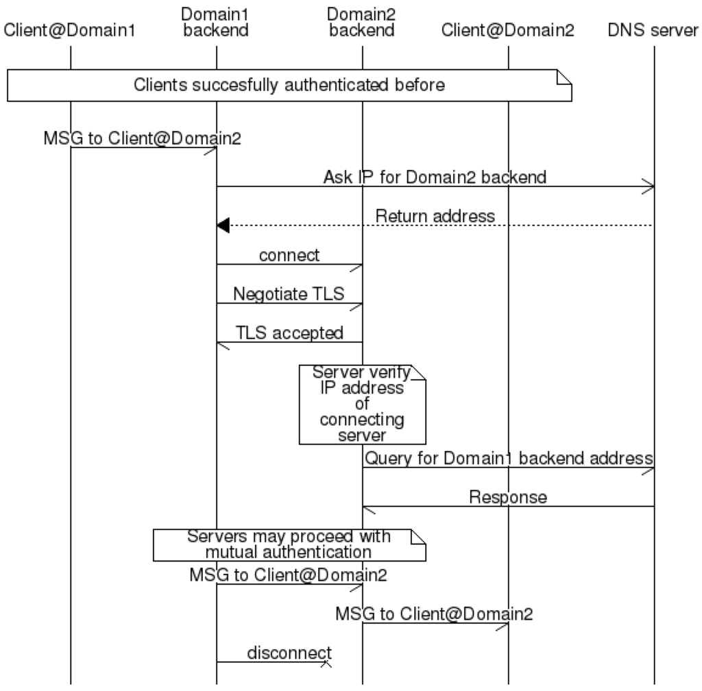 Server to server connection is an XML stream over a TCP connection, similar as to client to server connections. Most important difference is that server to server connections are not authenticated because they happen in between different domains that do not share a common user database. This is similar to how email systems work. XMPP servers may use XMPP Dial back, as defined in XEP-0220, to verify the domain of the connecting server. The domain administrator may require stronger identification verification by using TLS certificates and Simple Authentication and Security Layer (SASL). When M2M clients located in different domains would like to exchange messages, routing of messages will be done by the domain specific servers, Figure 11. Then communication link between servers of the domains are negotiated, to enable messaging between the referred M2M clients.