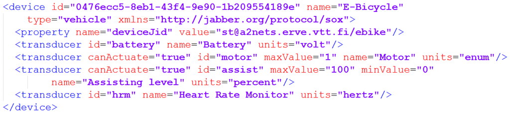 The XMPP communication architecture is based on distributed client-server model; however, also server-to-server communication is enabled. The core services of XMPP includes support for presence information, secure messaging (TLS), overlay communication over IP, near real-time messaging, authentication, contact list management, and service discovery. Each XMPP client has an account hosted by a XMPP server, and the client can be addressed by unique Jabber ID (JID). XMPP JID contains three parts: user, domain and resource as shown in Table 1, RFC 6122. In XMPP, network domain-part of JID must be a fully qualified domain name or IP address. Each domain presents one logical groups with one user account database. Each domain may present own user account policies. The device owner is usually considered to be also a user of the M2M domain and an owner of at least one XMPP user id. All devices share same user id (local-part and domain-part) with their owner. Separation of devices is done by examining the resource part of JID.