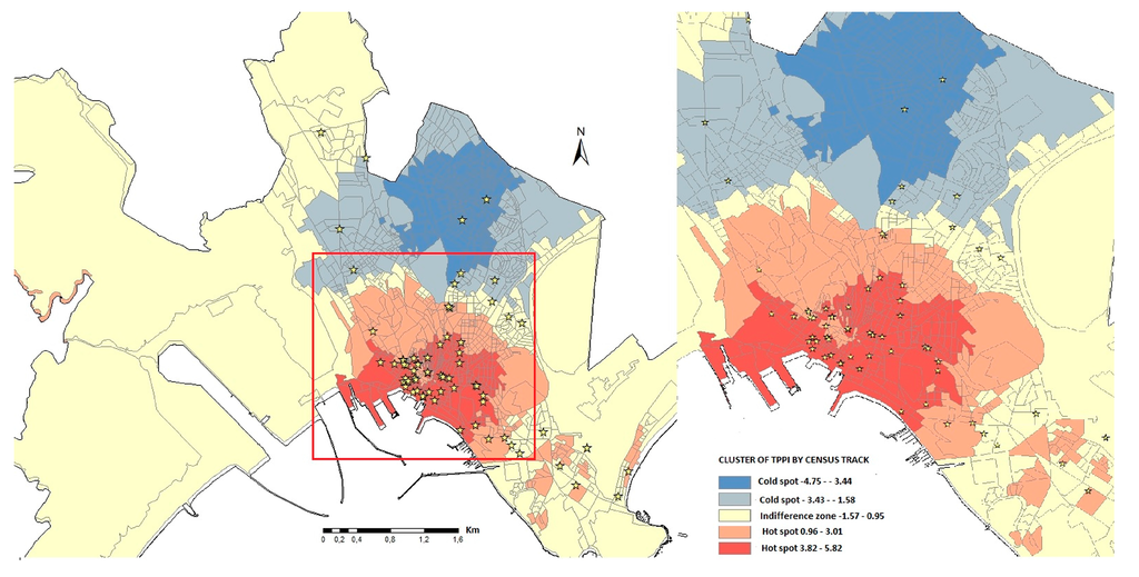 The map in Figure 3 shows the spatial clusters of preferences. The location of each TLS immediately allows one to detect which sites the preferences of tourists who visited Cagliari are focused on; thus, it is possible to answer questions such as, “What areas, sites, or artifacts attract the tourists’ attention?” Spatial clusters of preferences are detected by hot-spot analysis. Firstly, a threshold distance of 1700 m was identified and the spots by census tract summarized. The map in Figure 3 shows the spatial distribution of values of TPPI; the red areas, located in the inner areas of the municipality, show high concentration of the TPPI phenomenon (hot spot), while the blue areas represent locations where the phenomenon is less intense (cold spot). Not surprisingly, the inner areas of Cagliari attracts tourists while Pirri, a peripheral residential area of the Cagliari municipality, represents a cold spot.