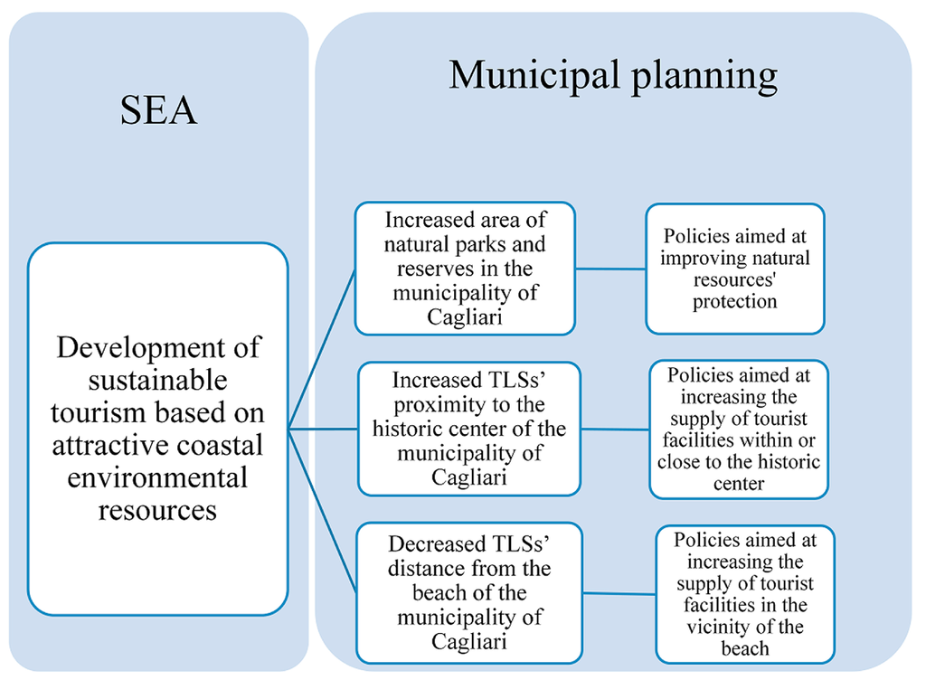 The four-step methodological approach we described and applied to the municipality of Cagliari in the previous section operationalizes the logical framework reported in Figure 1 (see Figure 4), related to the SEA process concerning the MMP of Cagliari. The spatial regression results show that the sustainability objective defined, in Figure 1, as “Development of sustainable tourism based on attractive coastal environmental resources”, would be effectively implemented through the following operational objectives (see Table 2, coefficients and p-values):