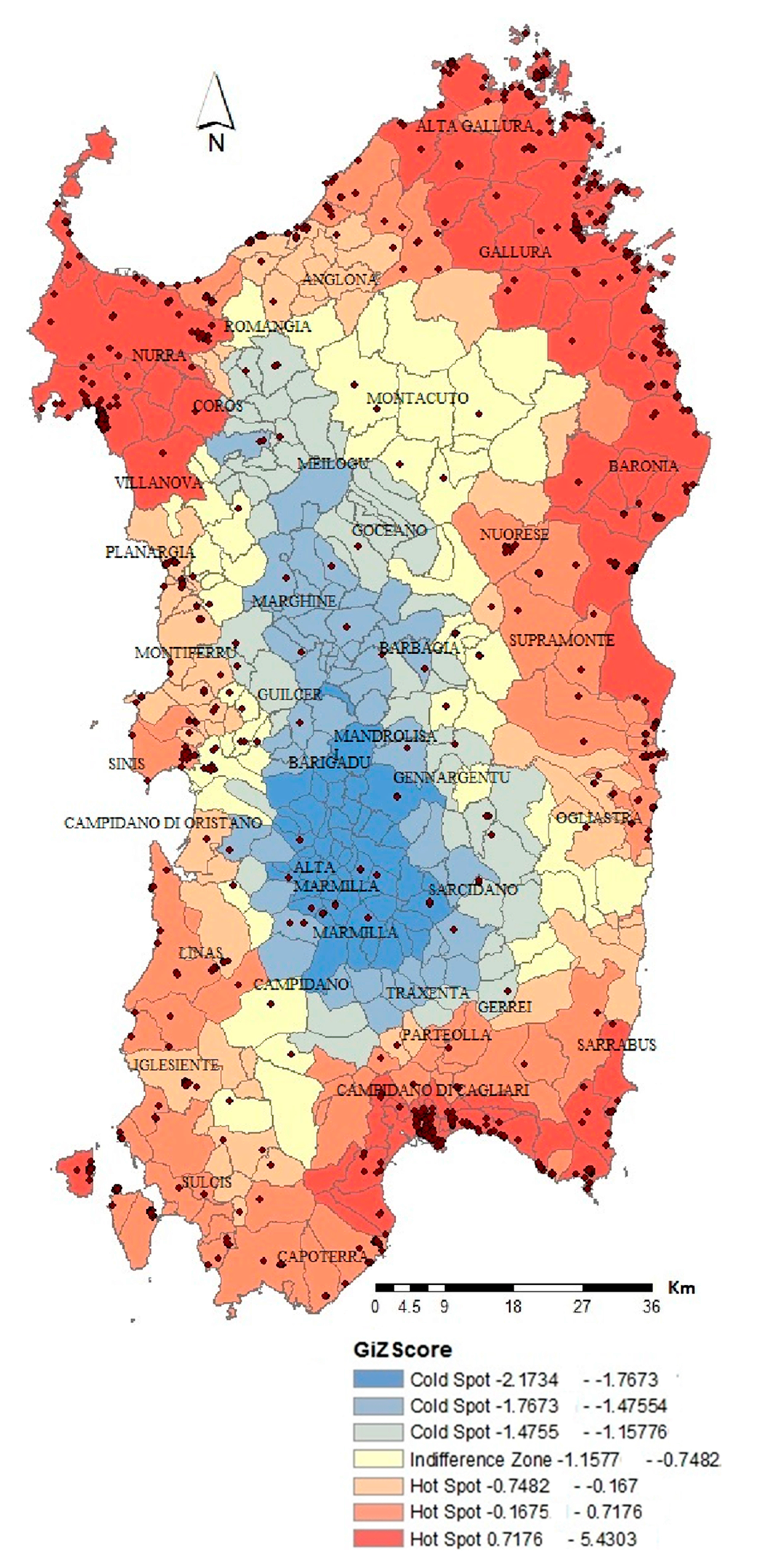 Figure 2 not only detects locations already affected by the phenomenon, but also identifies areas suitable for future tourist developments. It is notable that most of the municipalities located along the coastal area attract tourists, while the inner areas represent a cold spot. Moreover, the presence of three major clusters representing the spatial distribution of TPPI within Sardinia is important as well. The first cluster is located in the Nurra district and includes the Sassari, Stintino, and Alghero municipalities. The presence of this cluster is probably due to the attractive power of the municipality of Alghero; that is, the only municipality which preserves the Catalan tradition. The second cluster is located in the Cagliari metropolitan area, which entails that Cagliari is strategic in terms of tourism attraction.