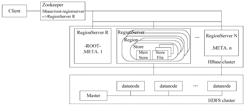 These kinds of data are ultimately stored in HDFS to shield the heterogeneity of the underlying system to make the cluster more reliable and the consistency of data is ensured by Zookeeper [13], a centralized service for maintaining configuration information, naming, providing distributed synchronization and group services. Figure 1 demonstrates the relationship between Hadoop and HBase.