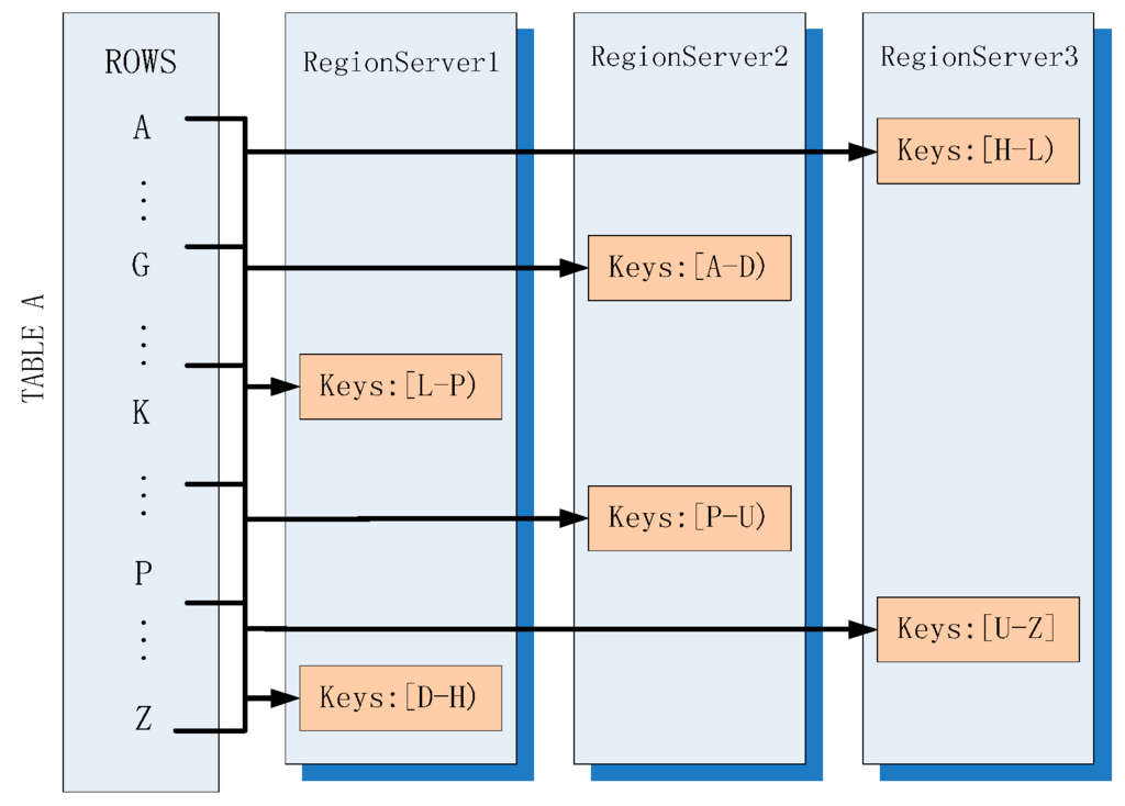 As shown in Figure 2, the table is divided into HRegions (region for short, the smallest unit of distributed storage in HBase) that are stored in different HRegionservers (also called Regionserver (RS)). Rowkey is used to address all columns in one single row and it is sorted on the basis of Log-Structured Merge Tree (LSM-Tree) [14] to speed up searching. A region will become larger with an increment in the volume of data and it will be split into two equal daughter regions when a particular threshold is reached. One RegionServer is composed of several regions but one region cannot be placed on multiple RegionServers. That is to say, a read and a write of one data entry will always be on the same RegionServer.