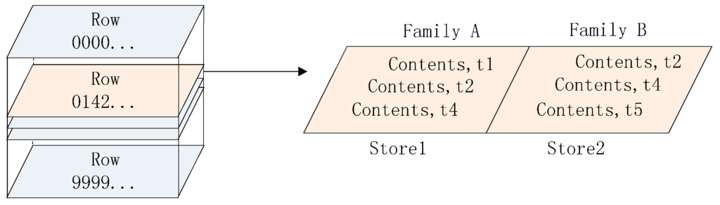 Each HRegion is split into individual Stores where data persist under the same family (see Figure 3) and each Store contains a MemStore and multiple StoreFiles. Data are first written onto the former and then flushed out of the latter when the predefined threshold is reached.