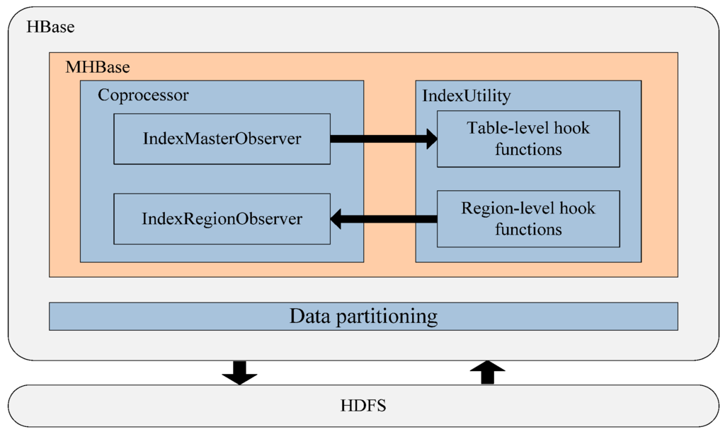 In this section, we will introduce the design of MHBase considering two aspects. First, we discuss the features of data partitioning to identify the main factors in meteorological systems so that they can be taken into consideration when designing the table. Secondly, we introduce the coprocessor-based index model in detail. The architecture of MHBase is illustrated in Figure 4. Our index model is built as an enhancement on top of HBase with a server-side component that contains two expanding instances of Observer to manage the indexes and the main idea of the model is to use an index table to store the value of all indexed columns to realize the secondary index.