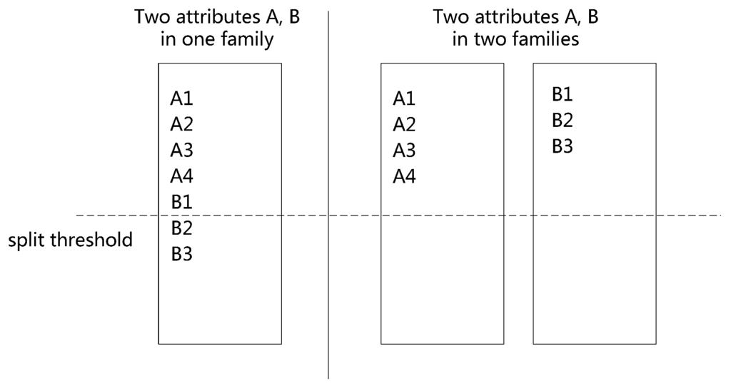Physically, each family is separately stored in a Store; therefore, the pace of horizontal partitioning depends on the vertical design. As shown in Figure 5, with the given data, the larger the number of families, the more difficult it becomes for a Store to reach its splitting threshold. Conversely, if each family contains more attributes, it will be faster to reach the splitting threshold.