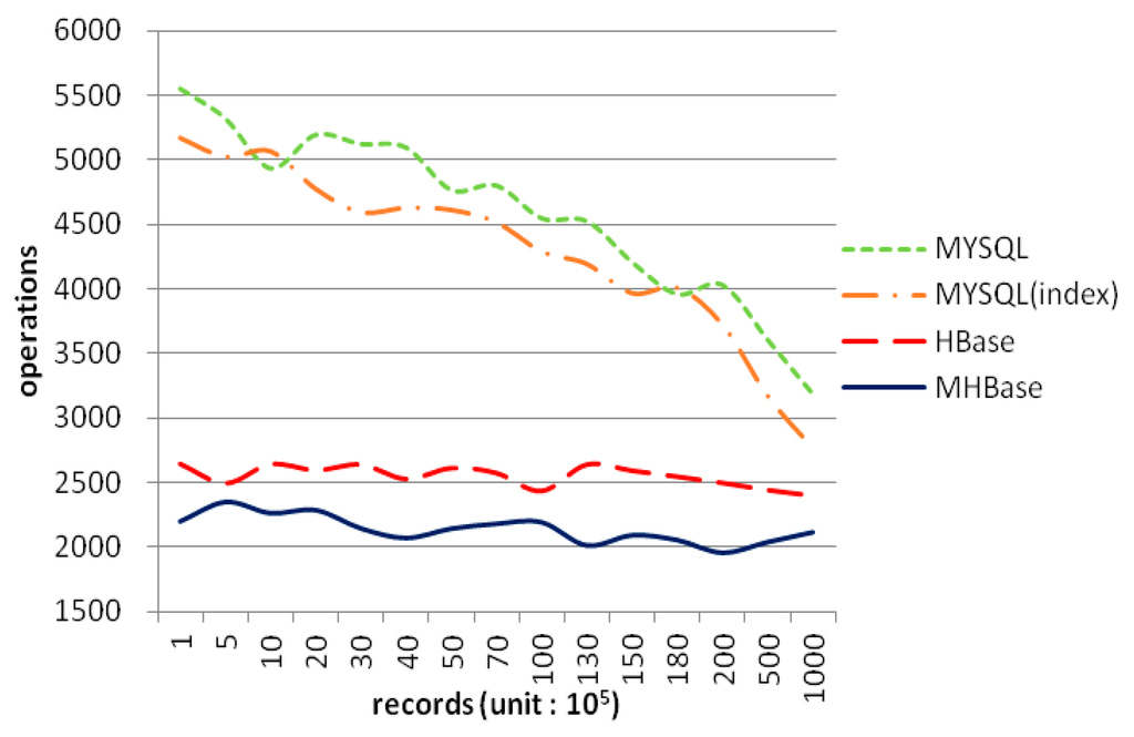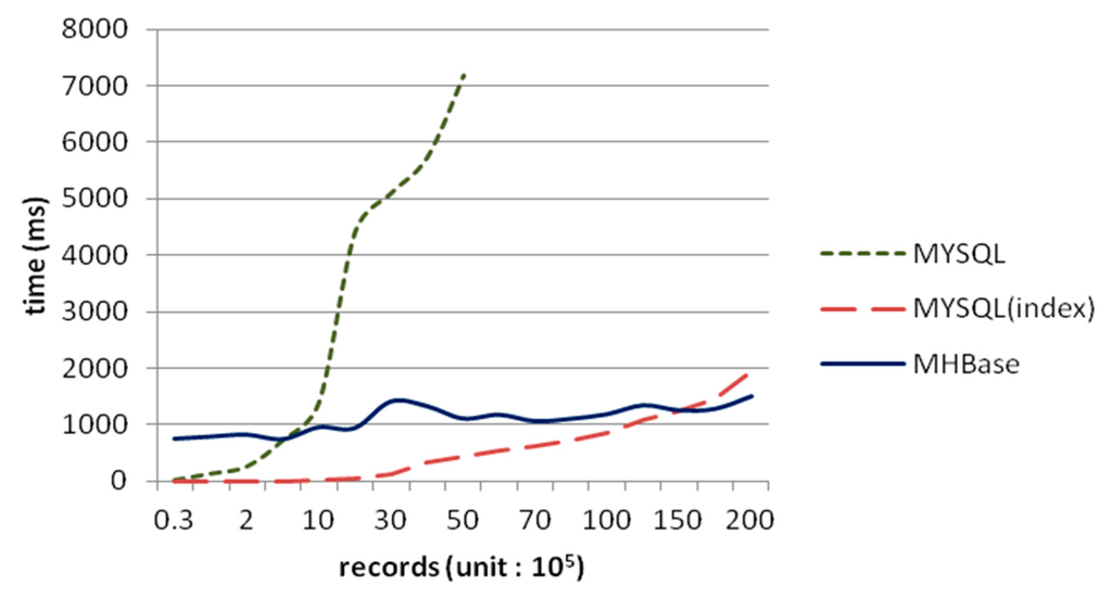 Just as Figure 7 shows, the execution time of importing dataset into HBase and MHbase is stable. Although the performance of MySQL with indexes is excellent in small datasets, it began to decline with the increasing data scales. In addition, the speed of data import goes down significantly. Nevertheless, MHBase retrieves records via coprocessors in region-level, and the rowkey of the table in HBase is in lexicographical (alphabetical) order, so time consumption can be considered as a linear trend of growth. Note that the performance of MHBase is also better than MySQL with indexes from 18 million rows. It implies that MHBase will be more efficient in dealing with large-scale data.