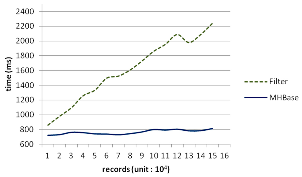 We already know that HBase would trade off read efficiency on fields other than the primary key. Thus, the only way to search columns without rowkey is to take up a full table scan by a filter. As a consequence, we also make a comparison between MHBase and HBase with filters within 150,000 rows and the result in Figure 8 shows that filters cost more time because filters scan a full HBase table, while the time of MHBase can be thought as constant.