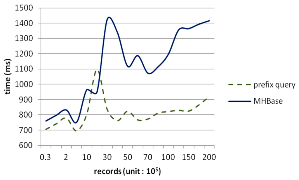 As shown in Figure 10, prefix matched queries can locate the range of target region directly and accurately, and afterwards filters work in the specific range. But MHBase use coprocessors to get records in a parallel approach; that is, the essence of an indexed query is one prefix-match and one rowkey-get operation, so it will be slower than retrieving directly by rowkey. The reason for the raised interval between two million and three million in the picture is that the region splitting causes I/O load to rise. The query’s response time for both methods are close to each other using millions of data but the diversity of retrieval by MHBase is increased.