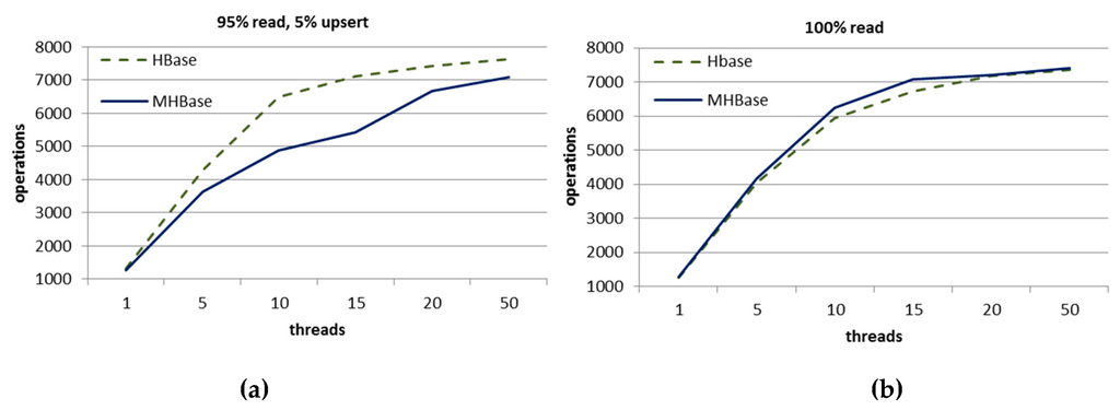 We also use YCSB (Yahoo! Cloud Serving Benchmark) [30] to conduct stress tests on both MHBase and HBase. We test the performance with different pressure. As shown in the Figure 10a, it is observed that the throughput of MHBase will reduce and is lower than native HBase when inserting data using ten threads concurrently and its write operation is not so excellent because MHBase needs to write to the index table synchronously. In Figure 10b, there is almost no difference in 100% read circumstance. Generally, both throughputs are improved with the increase of pressure (threads).