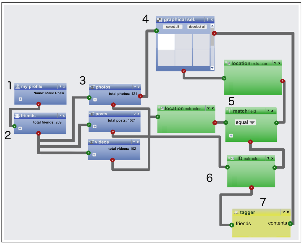 We grouped widgets in three categories. Data widgets correspond to the entity types that can be retrieved from the Facebook graph, such as a user’s profile information, friend lists, photo collections, the wall posts and so on. We represented them in the environment with a blue color. The second group contains manipulation actions, such as filtering by user’s selection or matching elements with a desired property value (e.g., the content was created is Madrid). The data manipulation color was green. The third group contained widgets that create new data in the Facebook graph (e.g., adding likes, tags, etc.). They were colored in yellow.
