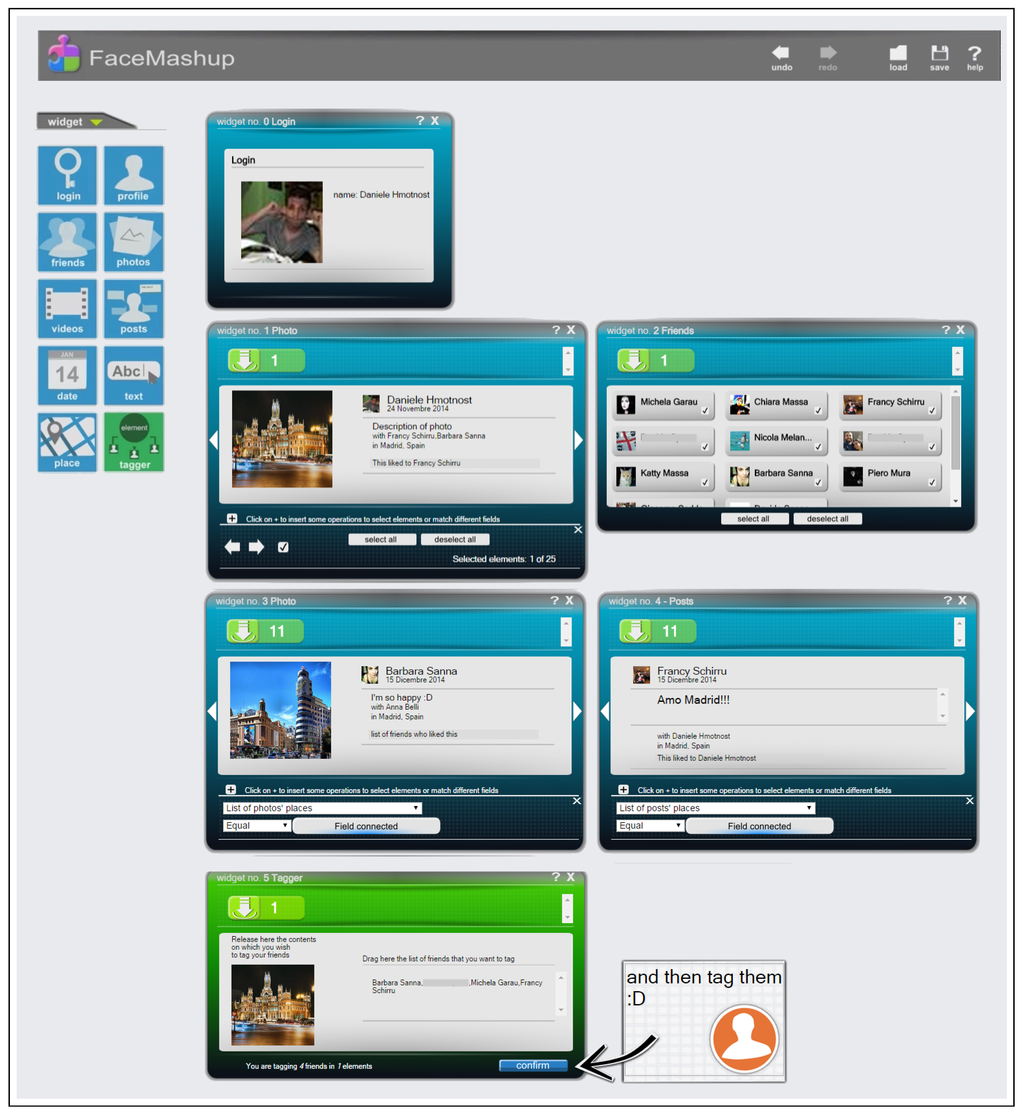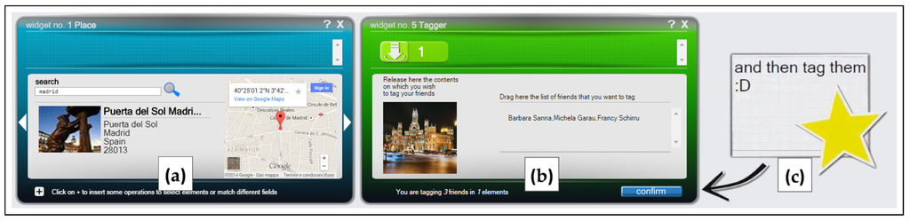 Finally, the application must tag the friends that created some content in the selected place. Bob inserts a widget in the environment which represents the tag action. It requires a set of friends: Bob drags the owner detail from the photo and post widgets. This concludes the definition of the application, which has been gradually executed during all the previous operations. The tag operation can be confirmed through a button. In order to execute the same operation for another place, Bob simply selects another photo: the contents inside the friends, photos and posts widgets change accordingly. In order to repeat the action on the new results, the tag operation must be confirmed again. A video showing all the operations in detail is available at [
