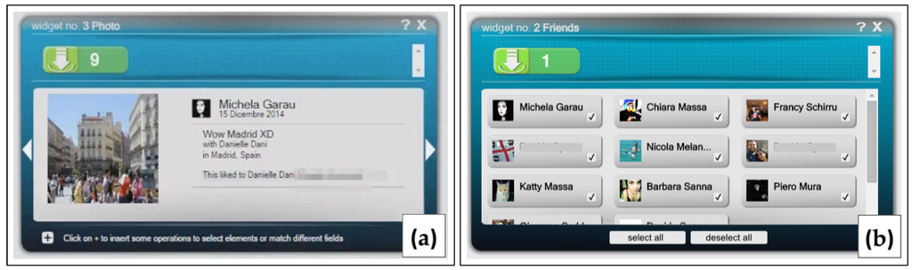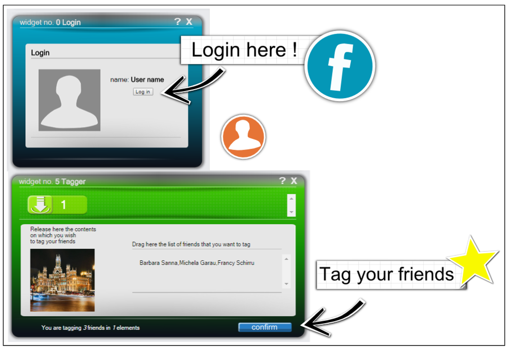 Figure 2. He starts from the log-in widget, which shows the information about his profile. Then, Bob inserts the photo widget, for allowing him to select one of his photos. When he inserts the widget in the environment, it suggests dragging a Facebook profile into the content area. Bob drops his profile picture contained into the log-in widget. The photo widget shows the list of his own photos. In a similar way, Bob repeats the same procedure for getting his friends list, inserting the corresponding widget in the working area and dropping his photo into it. The widget shows his friend list.