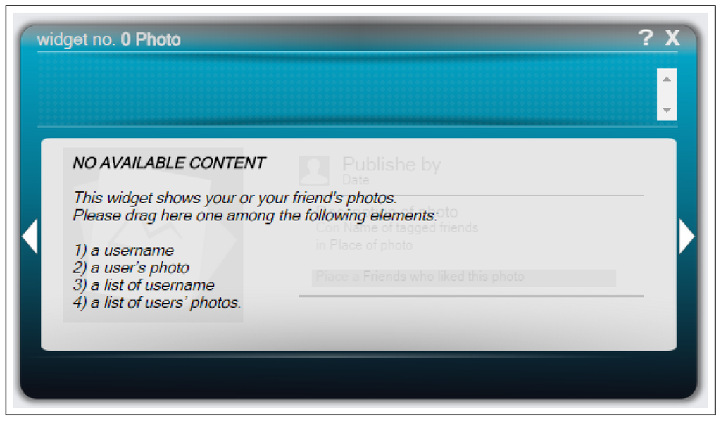 Figure 5 shows how a photo widget looks immediately after adding it into the FaceMashup environment. Since it needs one or more user profiles for retrieving a user’s photos, it suggests how the user can specify them dragging data from other widgets.