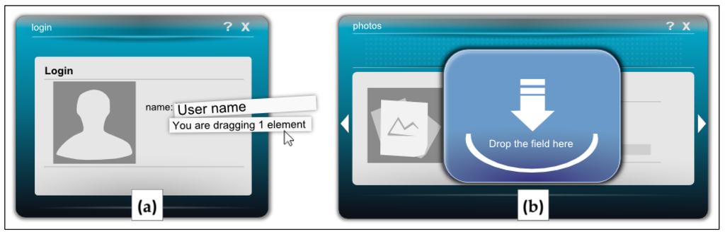 This operation is the most complex supported by the environment and, according to P3 and P4, the one where the user requires more support. The data transport between two widgets exploits a drag and drop metaphor: a UI element, which represents a data type or a data field, can be selected in a source widget, and it can be dropped inside another one. Such interaction specifies that the data corresponding to the selected element is the input of the widget where it was dropped.