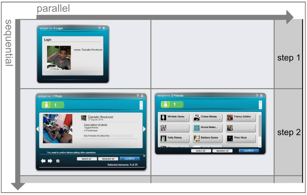 FaceMashup represents explicitly such ordering positioning the widgets inside the environment. It represents a sequential relationship between a widget A and B positioning B below A in the vertical axis. Instead, if the user may provide the information needed by both widgets at the same time (theoretically) or in any order (more practically), the widgets are represented in the same position in the vertical axis, aligned horizontally. This creates a grid of widgets, where rows represent sequential steps and column parallel operations.