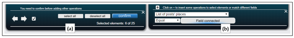 Figure 8b shows how it is possible to define a place comparison in a photo widget: the retrieved photos have all been shot in a location collected from another widget (Madrid in our scenario).