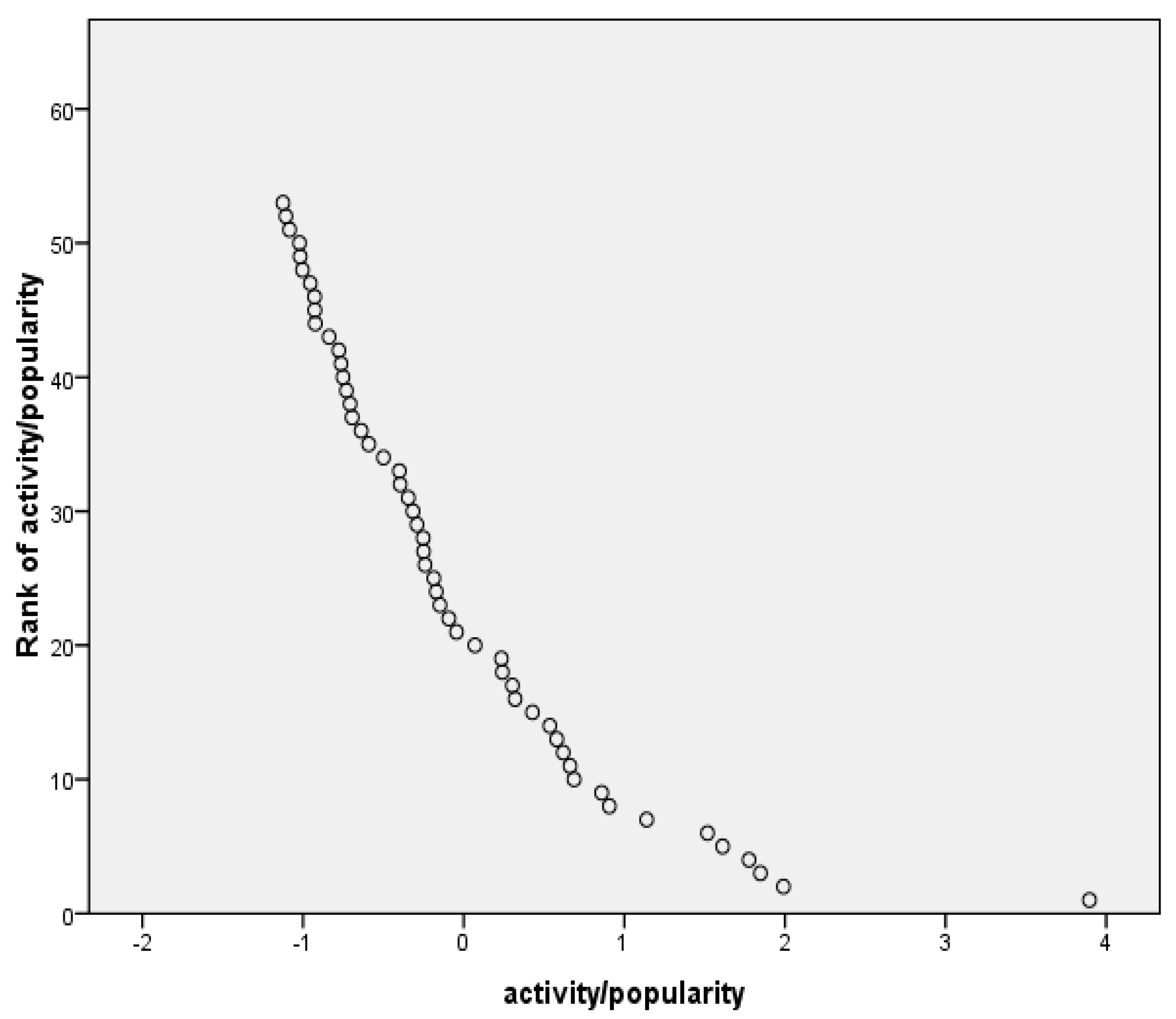 Regarding activity/popularity, the ministries of finance and economy of Latvia and foreign affairs of Finland have better rankings. Regarding community formation, the ministry of environment of Spain, education of Netherlands, foreign affairs of Italy and foreign affairs of Netherlands, come first. To explore how the three PC are distributed, and to distinguish the accounts that excel in every PC, three diagrams are constructed. Each one presents a scatterplot of the relative PC against its ranks. In Figure 1 the “activity/popularity” PC against its ranks is presented. One account is very distinct and is placed far right on the x-axis. Next, six more accounts are placed on its left and have the next best ranks. These are the accounts of UK foreign affairs (first), and UK education, UK development, Finland foreign affairs, UK finance, Latvia economy, Latvia finance (see Table 4). The UK seems to lead on using Twitter services, and Finland and Latvia follow having good scores.