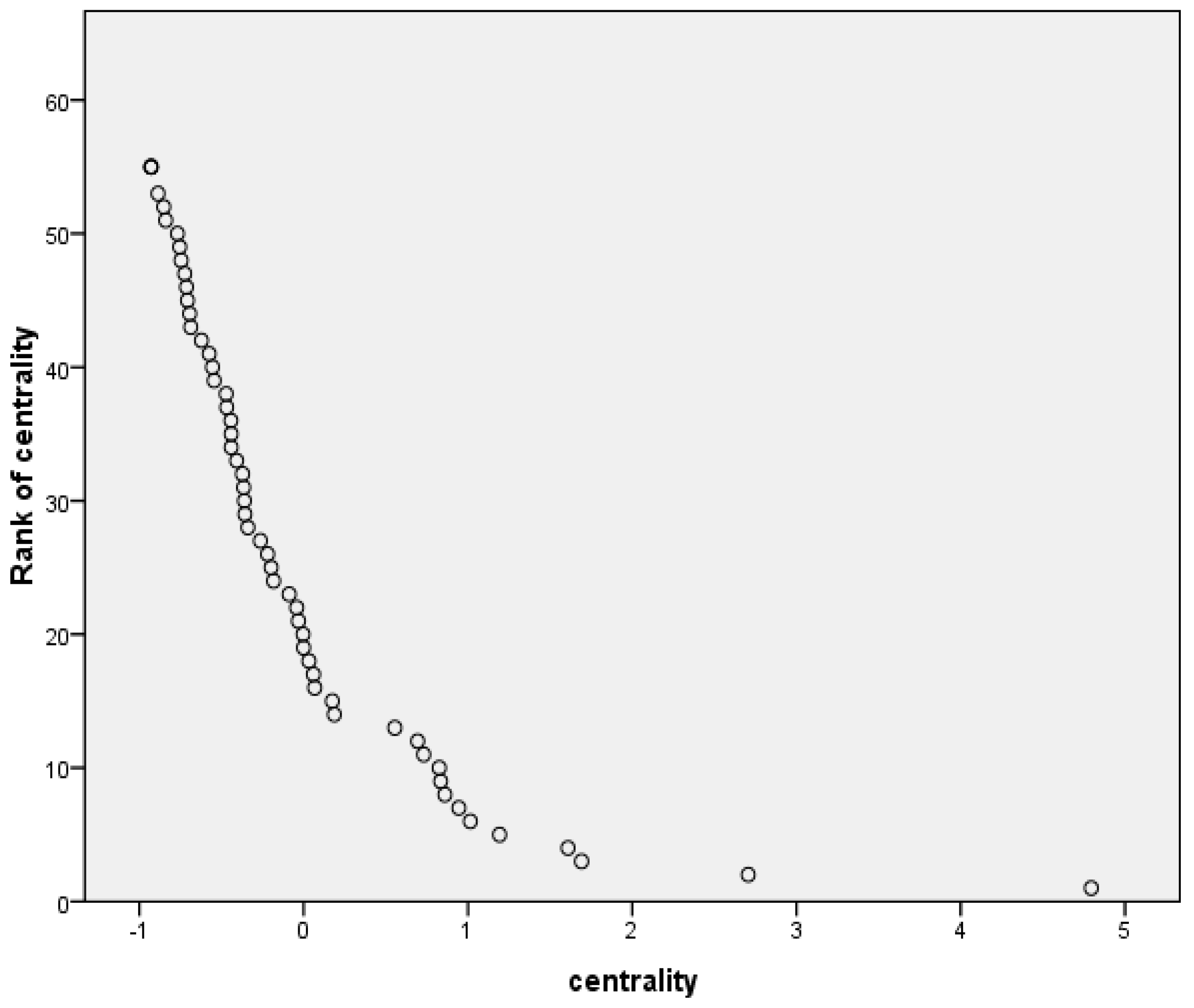 A calculation such as this eliminates the problem of the cases with missing values for some of the three indexes; this sometimes happens in small networks and in cases that the accounts have little activity. In these cases the rank of the relative index is assigned the largest value 56. Next, in the calculation of the final rank, the worst value is taken out.