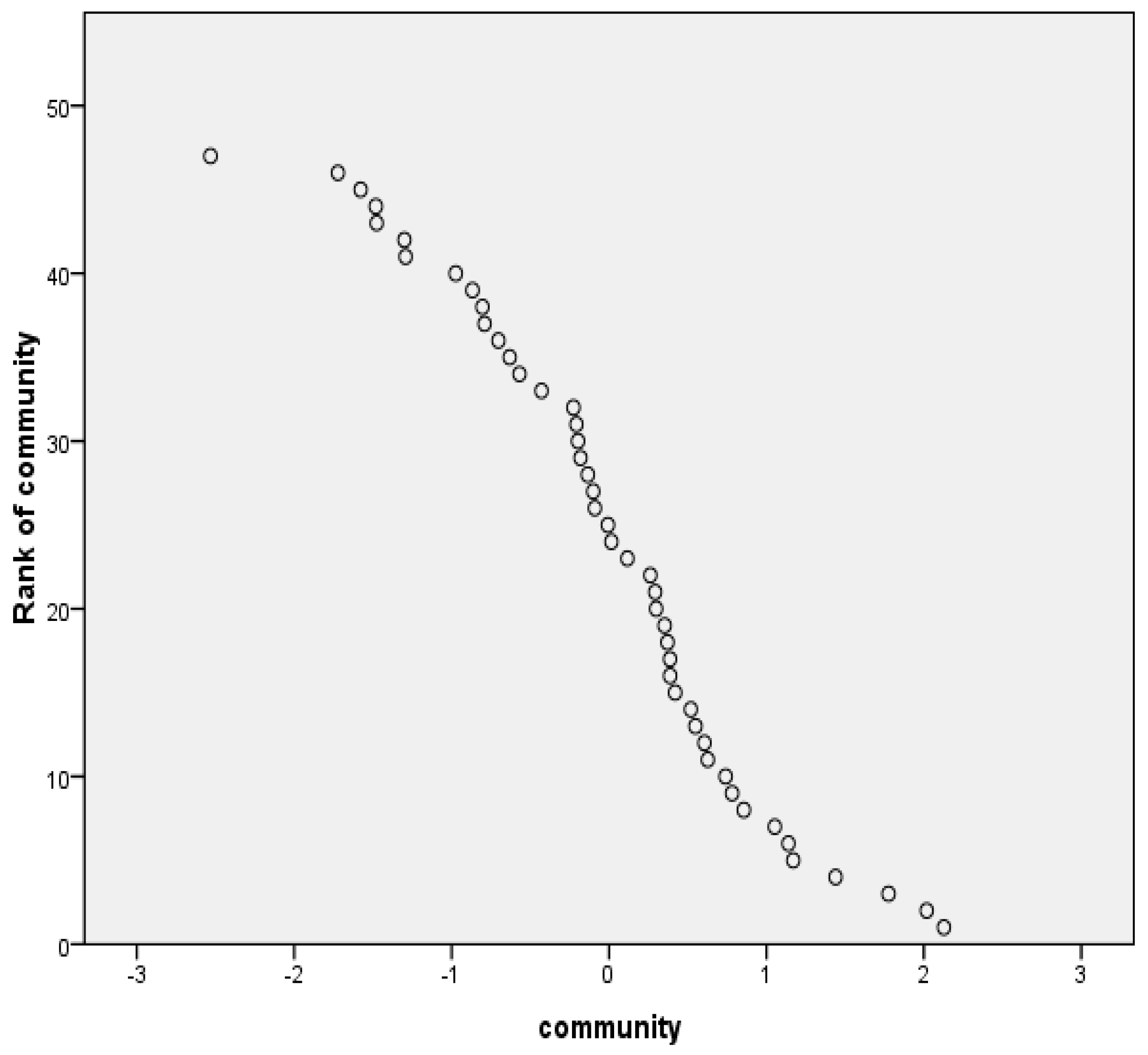Figure 3 presents the scatterplot of the third PC “Community” against its ranks. Four accounts are the most distinct (see also Table 4), the UK’s environment ministry, Spain’s environment ministry, the Netherlands education ministry, and the UK’s education ministry. In their m/r networks the conditions to form communities of followers apply to a higher degree than in the rest of the account networks.