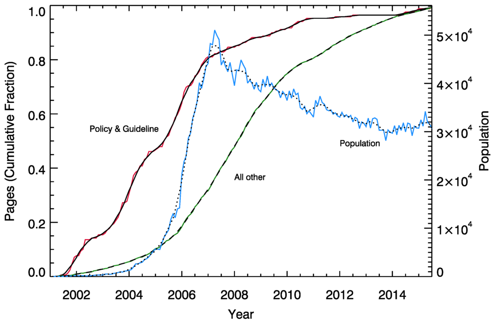 Most policy pages appear before the bulk of the population arrives: over half the policy pages were created by May 2005, before the population reached 20% of its maximum. By the time the population did reach its maximum, in March of 2007, over 80% of the policy pages had already been created. By contrast, the creation of non-policy pages in the form of essays and commentary lags population growth. When the population reached its March 2007 maximum, less than one-third of the non-policy pages were in place. It was not until a year later that half of the policy pages were in place. This is shown in Figure 1.