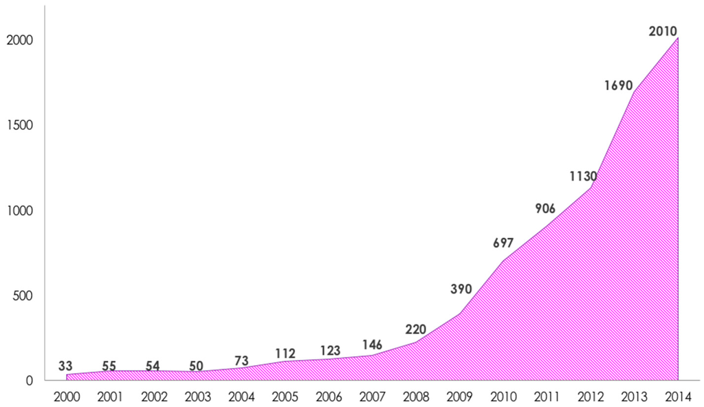 Number of papers published in the period 2000–2014 and containing an explicit reference to “computational social science” in the title (source: Google Scholar).