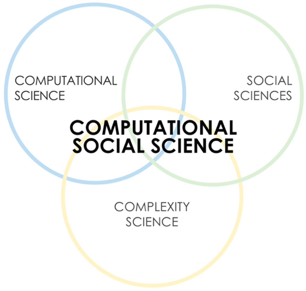 From a theoretical and epistemological point of view [,], computational social science, the “integrated, interdisciplinary pursuit of social inquiry with emphasis on information processing and through the medium of advanced computation” [], is grounded on a scientific perspective in which different research traditions flow into one (see Figure 2). The CSS scientific background is extremely varied and encompasses contributions from complexity science, general system theory, cybernetics, information theory, computer science, mathematics, economics, sociology, political science and many more. The theoretical foundations of the area can be therefore traced back to the seminal works of heterogeneous scientists, like Ross Ashby, Claude Shannon, Norbert Wiener, Herbert Simon, Ludwig von Bertalanffy, Harold Guetzkow and Thomas Schelling [].