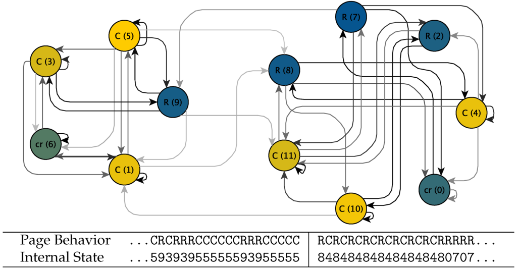 The network of transitions between states was sparse; any internal state had significantly non-zero transition probabilities to only a small number of others. States themselves usually had near-deterministic emission rules; a particular state usually had a near-unity probability of emitting one of the two possible R or C symbols. Informally, this implies the existence of a variety of interaction motifs, particular patterns of Rs and Cs, at the multi-symbol level.