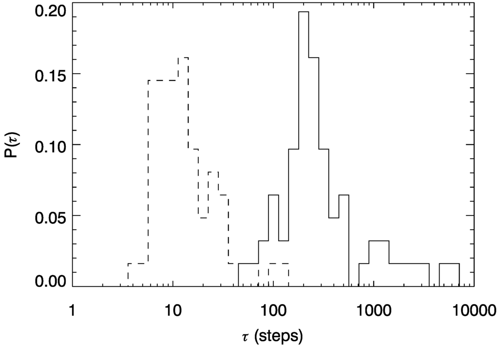 The distribution of relaxation times, τ, is shown in Figure 2. For all sixty-two pages, τ is exceptionally long. The average relaxation time in our sample is 698 steps, corresponding to a of roughly ; the median is 287 steps. The effect size is large; the median relaxation time for the null model is only 12 steps, and for any particular page, the observed relaxation time is on average 50 times longer than the null expectation. In the majority of cases (52 of 62), there is significant evidence that global machine structure, in addition to transition sparseness, is leading to these long relaxation times.
