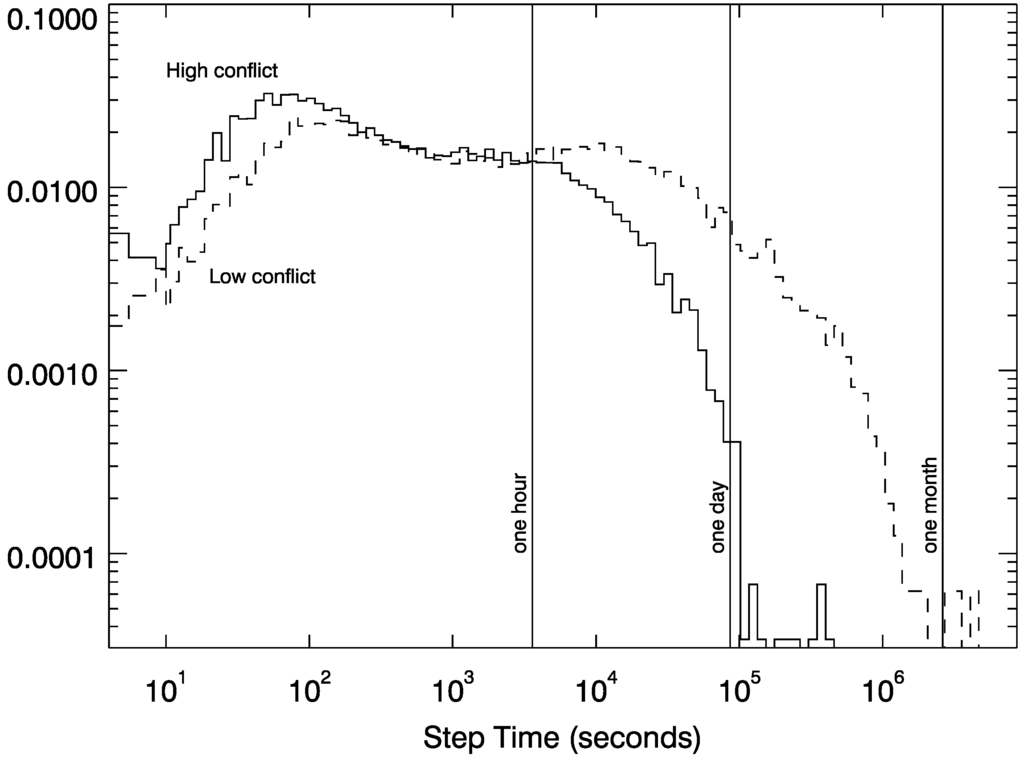 Distribution of edit rates for type one (high conflict) and type two (low conflict) subspaces. Shown here, as an example, is the spacing between edits on the George W. Bush page. When the system is in the high-conflict subspace, edits occur once every 212 s (median; 3.5 min); in the low-conflict subspace, once every 951 s, or every 16 min. When the system is in the high-conflict subspace, users almost never wait more than a day to take action.