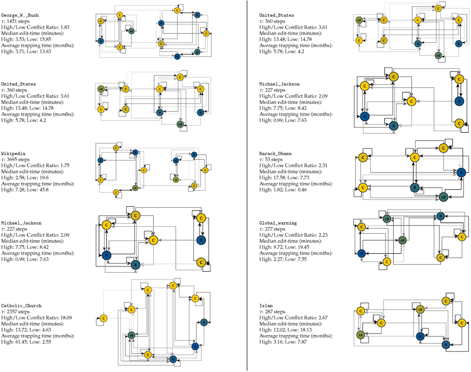 At the most coarse-grained level, this trapping places the system in either a low- or high-conflict state. In the high-conflict state, we also see an acceleration of activity by a factor of two or more. Subspaces are characterized by more than just overall levels of conflict: they have distinct motifs of interaction, including tit-for-tat (repeated reverting) in the low-conflict subspace, and propose-reject (C then R) and strong signals of vandal repair in the high-conflict subspace.