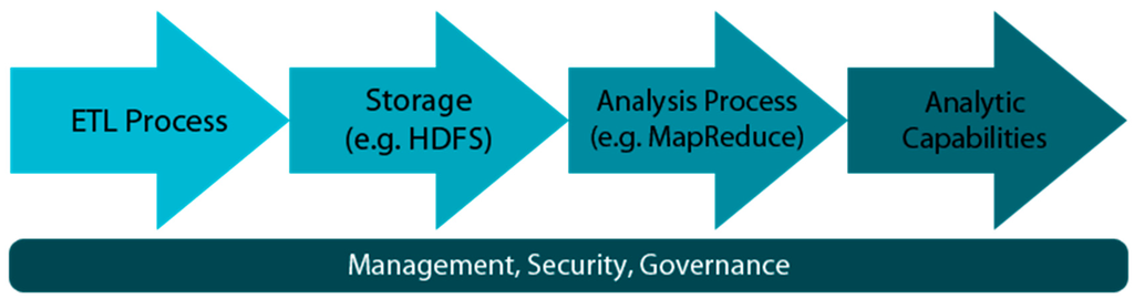 The current maturity of technologies such as Cloud Computing or ubiquitous network connectivity provide a platform on which to easily collect the data, store it, or process it [16]. This set of characteristics has allowed the rapid spread of Big Data techniques. Furthermore, not only can big organisations afford Big Data, but small companies can also obtain benefits from the use of this Big Data ecosystem [17]. A scheme of the typical Big Data ecosystem is shown in Figure 2.