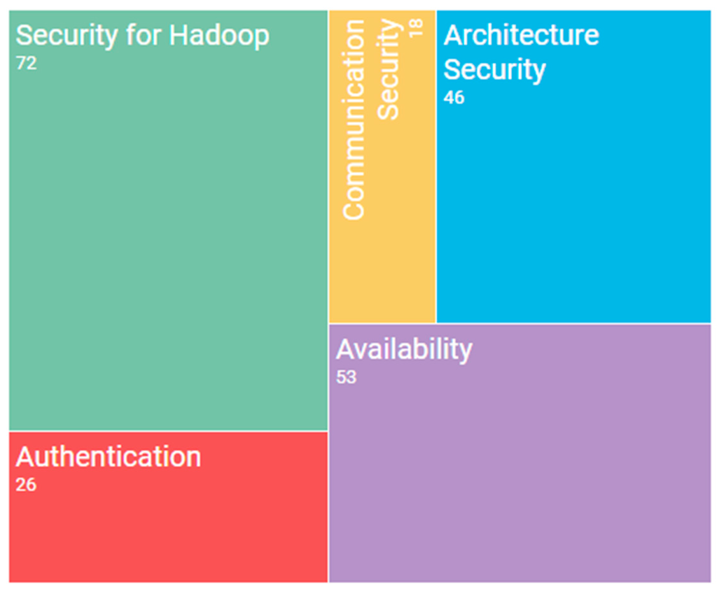 The graphic shows that the main topic dealt with by those researching infrastructure security is security for Hadoop. As explained in previous sections, Hadoop can be considered as a de facto standard for implementing a Big Data environment in a company. The security problems related to this technology have, therefore, been widely discussed by researchers, who have also proposed various methods with which to improve the security of the Hadoop system. This category is probably the most transverse since, in order to protect it, the solutions use different security mechanisms such as authenticity or cryptography.