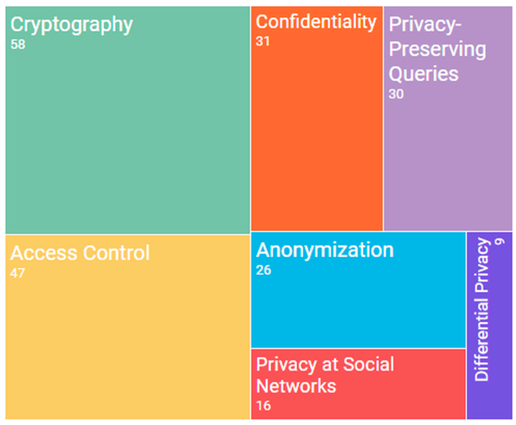 Organisations should not have total freedom to use that information without our knowledge, although they also need to gain some benefit from the use of that data. Several techniques and mechanisms with which to protect the privacy of the data, and also allow companies to still make a profit from it have therefore been developed, and attempt to solve this problem in various different ways. Figure 4 contains a graphic that shows the main ways in which this problem is dealt with, and the quantity of papers found for each specific topic.