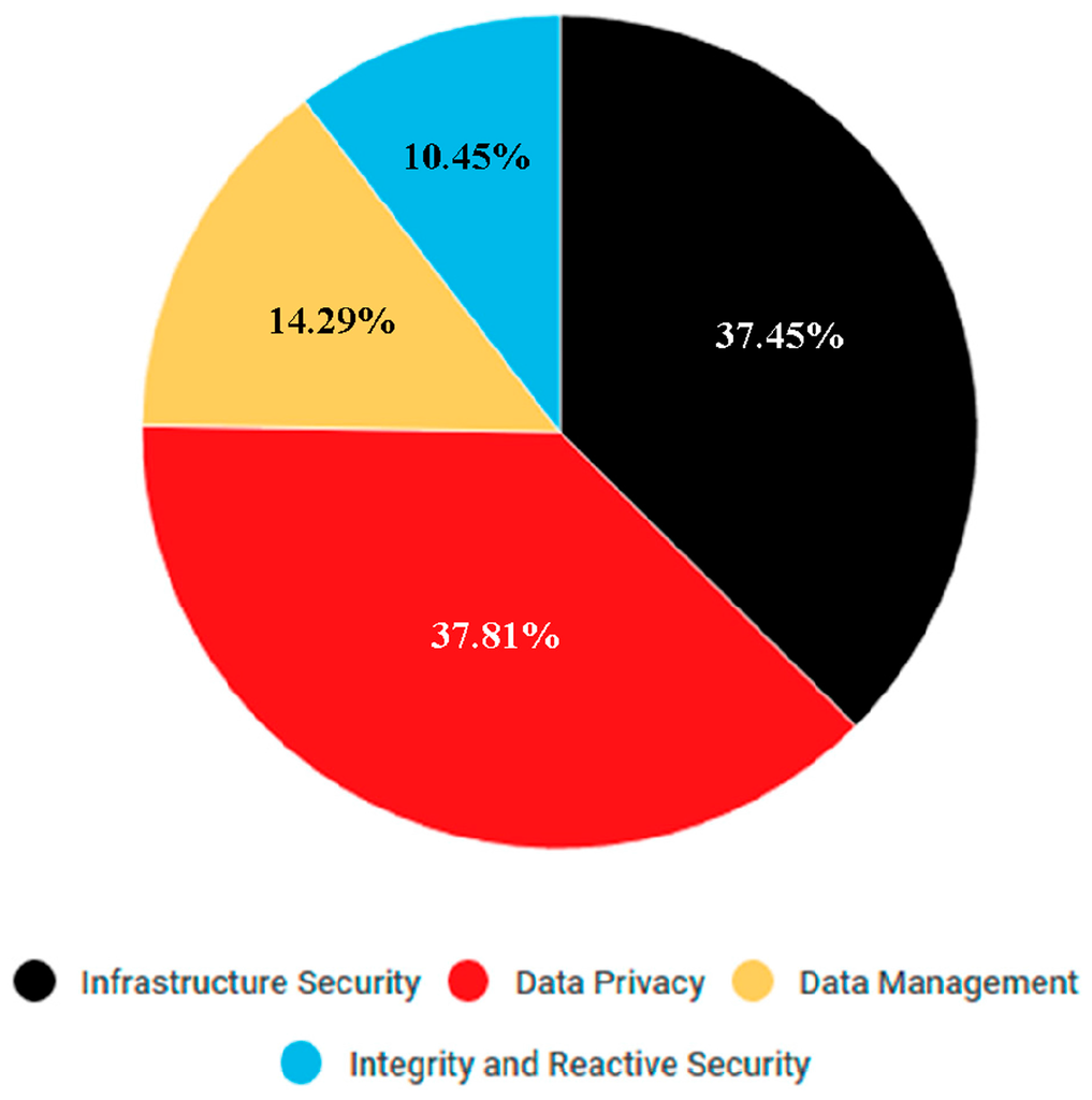 Figure 7 shows a pie chart with the amount of papers grouped by the different categories. However, according to the results of our research, and owing to the quantity of papers found that are related to this problem, we believed that it might be useful to split the privacy category into two different categories: privacy, itself, and access control and cryptography.