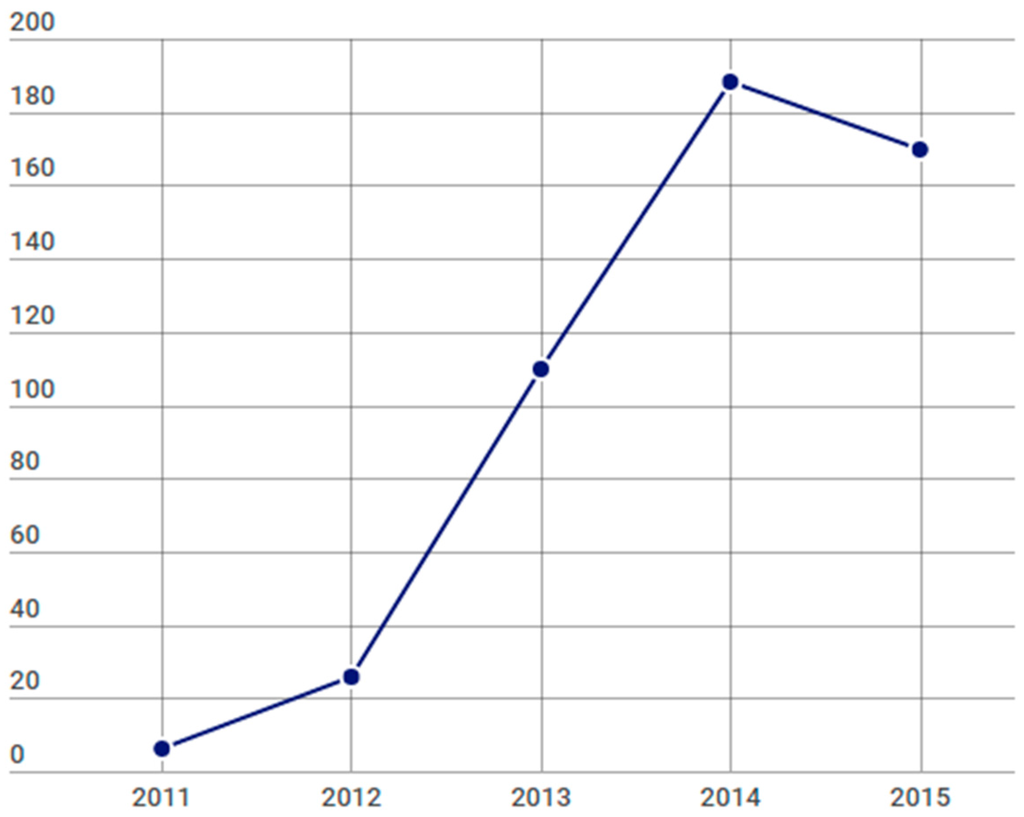 Related with the quantity of studies found per year, we have detected how the number of papers written by the researchers has been continuously increasing until the year 2015. This can be a consequence of the maturity reached by the Big Data technology. Figure 8 contains a graph with the evolution in the quantity of papers found during the considered period.