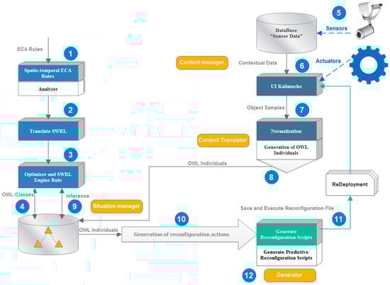 - Context Reasoner: is responsible for making inferences on the ontology information, determining and deploying the appropriate services according to the deduced situations. This component includes: